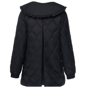 The Tess by Moke is a bold, fashion-forward poly fill, quilted, coat designed for the style-conscious Moke woman. Featuring an oversized fit and a distinctive scalloped, detachable collar, Tess makes a confident statement. Finished with an elegant double-needle diamond quilt and a raised logo patch, this standout piece is guaranteed to turn heads wherever you go.